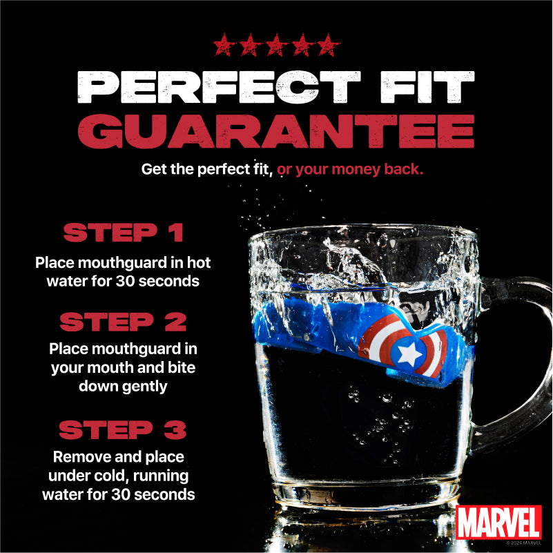 Defend your smile like a true Super Soldier with the SafeJawz Marvel Captain America Mouthguard. Featuring the iconic star-and-shield design in red, white, and blue, this officially licensed Marvel mouthguard offers battle-ready protection with a patriotic edge. Built for high-impact sports, it combines bold visuals with SafeJawz’s trusted tech to keep you protected and performing.